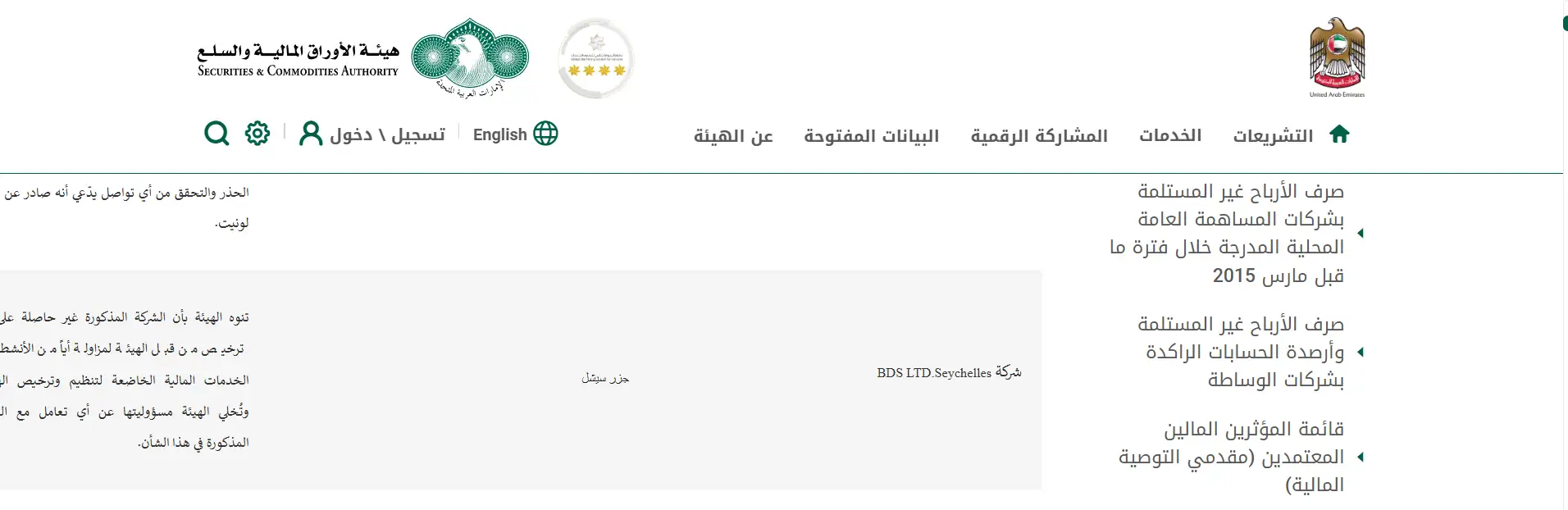 ورد تحذير رسمي من هيئة الأوراق المالية والسلع في دولة الإمارات العربية المتحدة بشأن شركة BDSwiss، تفيد فيه بأن الشركة غير حاصلة على أي ترخيص صادر عن الهيئة يسمح لها بممارسة الأنشطة أو تقديم الخدمات المالية داخل الدولة.